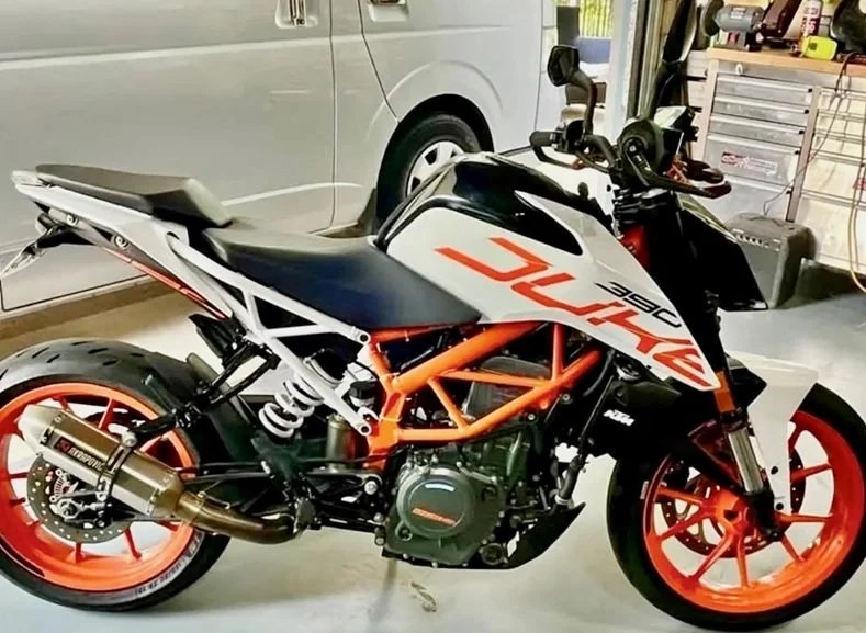 The stolen motorcycle is a white and orange KTM 390 Duke motorcycle, registration number 5BP94.